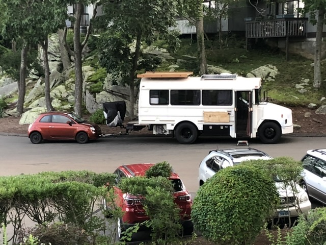 When we pictured our final setup, this is what we came up with. Our shakedown trips made us – we thought – conclude that a Toad would be super useful. While this looks manageable, this clean setup belied problems to come.Here’s what happened. First, the added double receiver for bikes and car added stress to the hitch, causing it to twist. Shout out to Buddy at Saunders Automotive and Trailer Center in Ellsworth, Maine for a quick repair of the hitch. After about an hour of backroads driving leaving Acadia, we pulled over in the Holden, Maine Post Office for a final check before getting on the highway south. We could immediately smell the hot brakes of the Fiat. The front brakes had been dragging – not locked – for long enough to melt parts under the hood and be near to actual fire. Had we proceeded to the highway, the car would have burned. The results could have been catastrophic.This is what we think was responsible. The NSA Hercules tow bar uses a cable-actuated surge brake for the Toad. We believe the cable got stuck – perhaps where it passes through the firewall. We will never know why the brakes dragged and nearly caught fire, but we did get scared off of towing. It did not help that neither the manufacturer, NSA RV Products in Kansas, not the installer, Trailer Depot in Connecticut, would even entertain the possibility of contributing to the failure. So while we can’t blame either, we feel that their respective defensive positions showed a lack of integrity and unwillingness to learn what actually happened.This is the cost of repair. Richie at Morall Brake shop in Brewer, Maine took very good care of us. The repair would probably have cost double in Connecticut. All told, we have about $5k into the aborted Fiat towing attempt. We’ll delay our final assessment of the situation, but we’ll probably sell the car.We learned that downsizing is an ongoing process, and includes many aspects of our lives. We made it a point to enjoy Bangor while waiting for car repair. We stopped by Stephen King’s house and soaked in the friendly vibe of the lovely waterfront.The wait time did afford us time for the highlight of our trip – a visit to the Bangor Police Department to see the Duck of Justice. Officer Tim Cotton (follow them on FB) writes with compassion about you the travails of day to day life – a message we need to try to embody ourselves.It’s a lot of hard work to get this vibe!