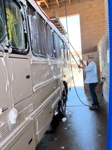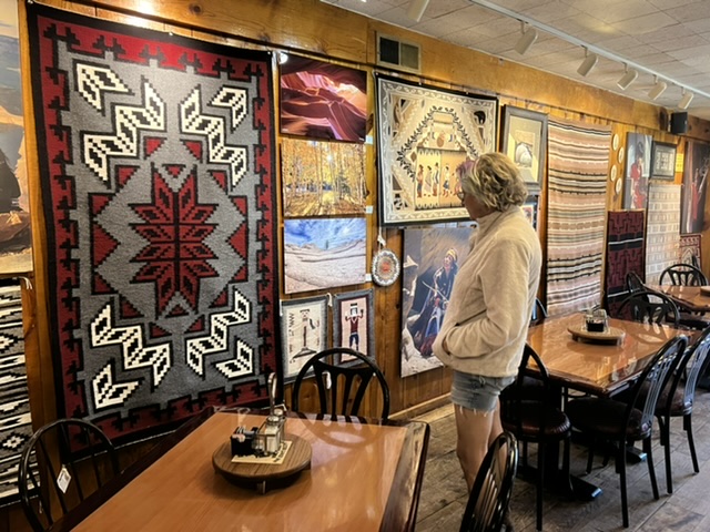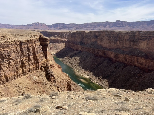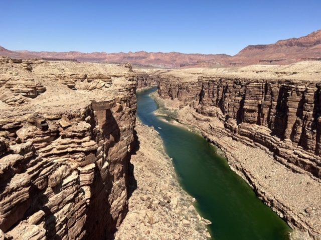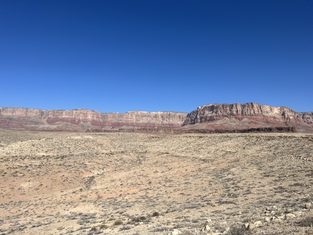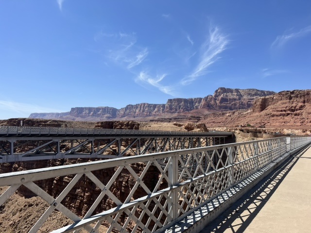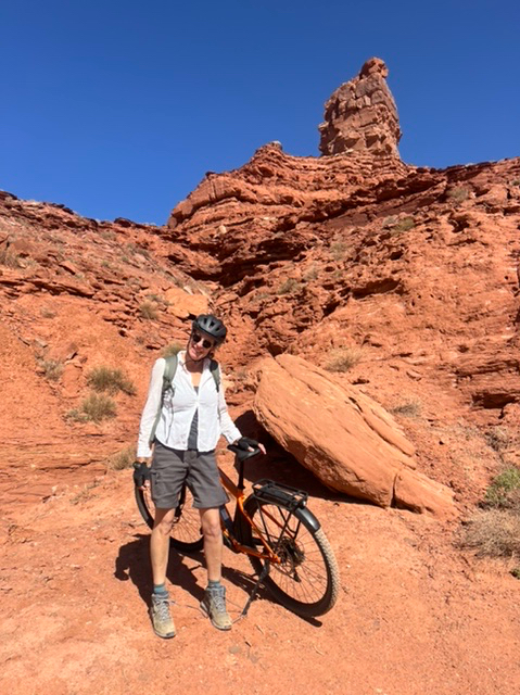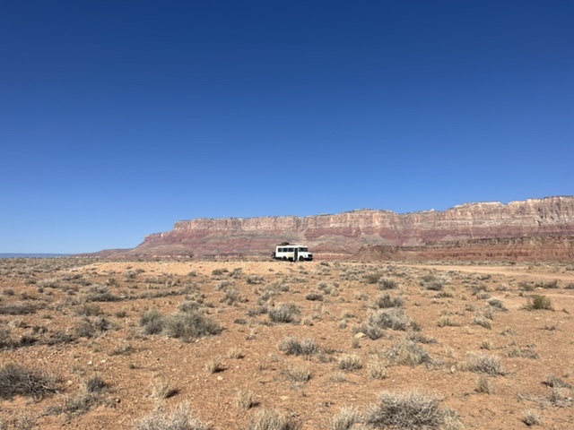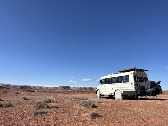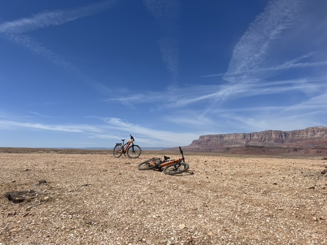 A bridge over the Animas River in Durango. The town has great bike paths to get around.En route to Durango, we got our first glimpse of the snow covered San Juan Mountains. Painting by Holly.The next day we found ourselves on more BLM land. This was our spot in Valley of the Gods, near Bluff, Utah. This is part of a 17-mile road with many free campsites. Most of the dirt road is manageable in normal cars and SUVs.We biked much of the Valley of the Gods.You can see how fine the red dirt is. Before we departed, we rode out a windstorm with 50 mph gusts that utterly blacked out the vast valley.We spent one night at Walmart in Page, AZ, where we stopped to see Horseshoe Bend, a charming meander below the Glen Canyon Dam and Lake Powell. The town of Page charges $10 to park and look at the river. We never do stuff like that, and here’s why. I calculated that Page is pulling in tens of thousands of dollars daily from parking. I hope local teachers are well paid!We couldn’t wait to get out of Page, but not before Sandy got a bath.On our way to our next BLM spot, we crossed the Navajo Bridge over the Colorado River, near Lees Ferry. The old bridge is now a foot bridge, and has a Navajo market at one end. We saw a California Condor over the river valley. The quality of the Navajo art and crafts was stunning.This is our free BLM spot in Marble Canyon, just down the road from the Navajo Bridge. This land is directly on the Colorado River. In the background, to the west, is one edge of the Vermillion Cliffs National Monument.The Colorado River above Marble Canyon. Fun travel facts: There is no ferry at Lees Ferry; there are no cliff dwellings down the road at the Cliff Dweller Stone House; and, there is no lake farther down the road at Jacob Lake. Plan accordingly.Marble Canyon, AZ.Marble Canyon, AZ. Sandy is centered in this picture.Our ebikes are letting us cover a lot of ground. We love them!Sandy at night in Marble Canyon. This is pretty, but we haven’t seen the dark starry skies yet. We have either moonlight, as here, or clouds and dust.Leaving Marble Canyon heading west, we hugged the Vermillion Cliffs for about 30 miles until we climbed to the Kaibab Plateau. We reached almost 8,000 feet of elevation and thought we were in Vermont! From Jacob Lake (no lake) at the top, one can turn down Route 67 to the North Rim of the Grand Canyon. That road is closed until May 15. There is endless free camping along North Rim, which gets only 10 percent of the annual visitors to the Grand Canyon.We had a wonderful late breakfast at the Jacob Lake (no lake) Lodge, surrounded by stunning Navajo paintings and textiles.Our next rig.We were soon off the Kaibab Plateau and in the town of Kanab, UT. This museum is closed for renovations.We stopped by a laundromat/car wash in Kanab. Luckily we only needed to put some things in a dryer.Not far north was our next BLM camping spot, just outside of Zion National Park. This is a serene spot with lovely views.Our spot outside Zion NP.Moonrise to the east.