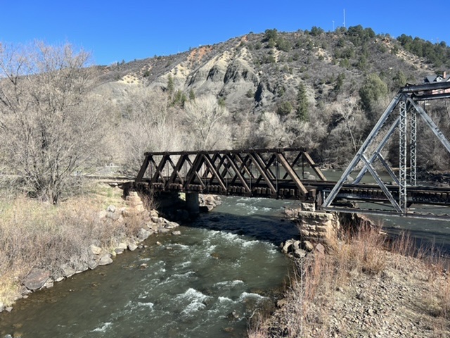 We had intended to head directly west from New Mexico, but a guy in a bike shop (with a giant screen map in the shop!) convinced us to travel north on US 550 – the Million Dollar Highway – at least as far as Durango, CO. We took his advice, and the drive was lovely, especially the recommended departure onto State Route 213. Durango is a very cool town, with a local ordinance that each resident must own two mountain bikes and a cool truck. However, we were overwhelmed with the crowds and traffic. We’re more sensitive to that then in the past, and we’ve always been sensitive to that. We stayed a night in town and headed west on US 160 the next day. For a day we saw trees and a river before heading back into hardpack and dust.