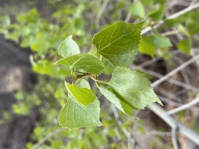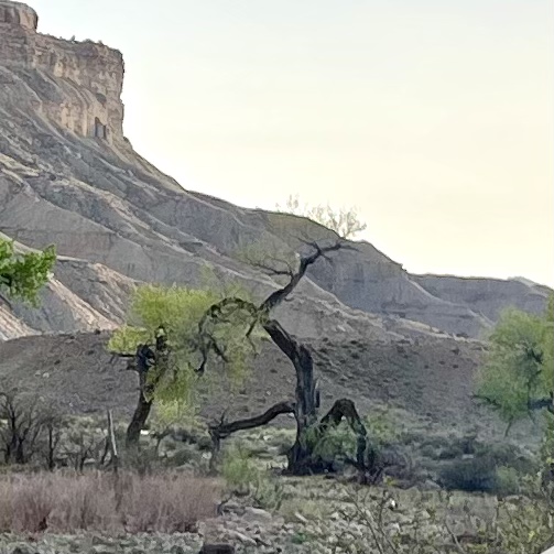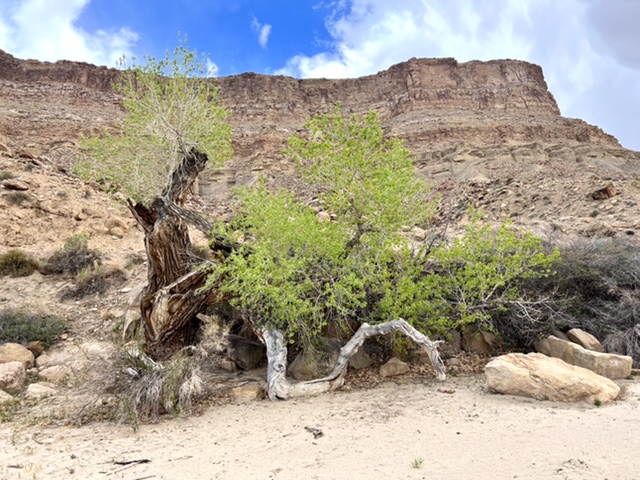 Of the many things we’re seeing for the first time, cottonwood trees have made an impression on me. We first identified them in San Lorenzo canyon in New Mexico. Before that, we had seen these twisted, mangled bare trees, and weren’t sure if they were dead or just dormant. At the same time, we started seeing very light colored debris, that appeared to be tiny heart-shaped pieces of thin paper, littering the trails. It was at San Lorenzo in early April that we noticed these same trees starting to blossom in the most luminescent light green – their young leaves a thin and delicate heart. The piles of heart-shaped “paper” debris still littering the ground below them.