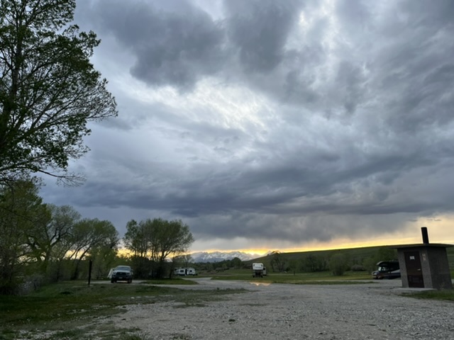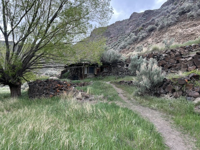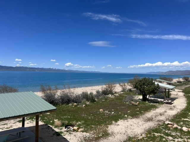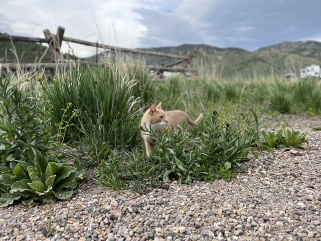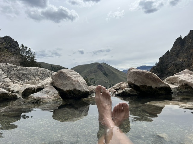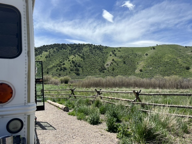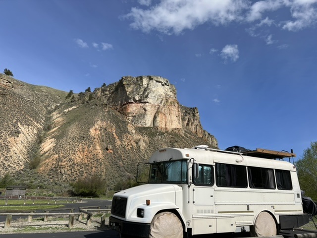 I’ll include this one pic from my time in Salt Lake City. Holly was gone for over a week. I made sure the bus was super clean for her return.Upon Holly’s return, we headed east out of the Great Basin, over two mountain passes, and to the shore of Bear Lake, which straddles the Utah-Idaho state line. Whether it was the shock of sky and water or the distance from the SLC area I can’t say, but here I felt I could breathe.From there, we made our way to Lava Hot Springs, ID. This was a free camping spot, right along a busy freight rail line. We made new friends here along the banks of the Portneuf River. Johnny continues to adapt, and has become keen on micro-adventures outdoors.We have become fond of magpiesI can’t capture how lovely this hike was. We did a rigorous hike to the Goldbug Hot Springs, and were in awe each step. The springs themselves were lovely, ranging from icy cold to 113 degrees. My Goldilocks temperature was 108. There were just a few others souls there, ranging from pretty-much-naked to naked. We remained modest.Too hot.Just right.Goldbug Hot Springs is just off US93 in Elk Bend, ID. This route follows the Salmon River, and is simply majestic. Just up the road, we found this cheap BLM campground – five bucks a night – on the river bank, just opposite Tower Rock.While searching for a camping spot on the Salmon River, we came across this spot. It is the former home of the ’last of the Idaho hermits,’ Dugout Dick. He fashioned a home with gardens, and orchard and livestock in this spot for 70 years. We had Sandy climb Lost Trail Pass out of the North Fork of the Salmon River Valley, into charred forests of southern Montana. We found a lovely spot for free on state land along the Yellowstone River in Big Timber, MT. The town itself is charming, despite its spot on I90. We have only dabbled in Idaho and Montana. These states will get our full attention next time around.