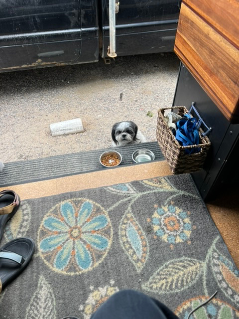 And while I chose to not write the last chapter, I am now writing this chapter in medias res. Pardon the disjointed narration. Some context is needed before I describe our descent into Mexico. I am sitting in a small campground in San Ignacio, Baja California Sur, Mexico, in the partial shade of date palm trees, watching a burro and a pair of Canadians. Holly is starting some art. (We recently revamped some storage to allow for acrylics.) And we are checking the weather for a whale watch on the lagoon at Ojo de Liebre. None of this more than hints at what the last month and a half have been like. I’ll begin, as I mentioned, here: