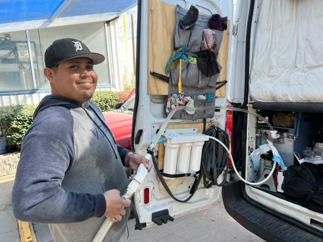San Felipe was also our first Mexican town. We had to pick up skills fast: How to say t-shirt, how to order tacos, how to buy water, how to read road signs, how to drive on tiny streets. One of our first tasks was buying drinking water. Even residents do not drink from the municipal supply – if there is one – so people shop for agua purificada, readily available in every town. Most people use 5-gallon jugs and bring them in for refilling. However, we have a 40-gallon tank on board, so we need a shop with a long hose. That has been an issue at times. We also had no gravity fill on our tank, so we learned fast how to use a hardware store. After we fabricated a fill port, we bought our first purified water, at a cost of one peso per liter (about 20 cents a gallon).
