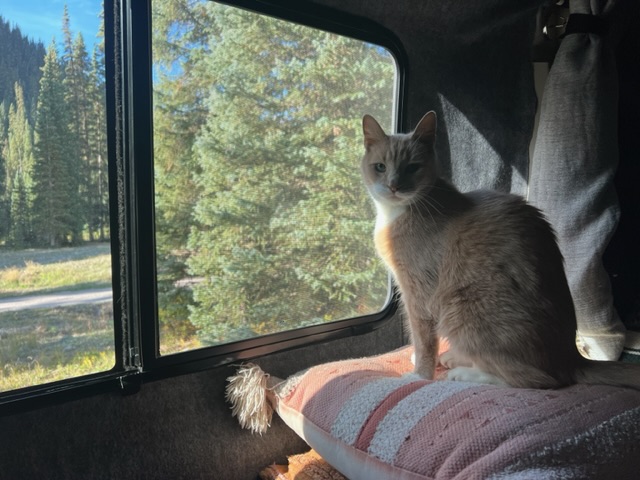 Not every day is like that though. Days are days, peaceful or stressful, smooth or jagged, pretty or plain. Patterns emerge, and here are mundane truths. We prefer to avoid people, in general, and cute towns. If someone says ‘You have to see this adorable town’, we probably won’t care for it. On the other hand, some towns we like. Shelby, MT, Salmon, ID and Rico, CO come to mind. We still need big towns to provision, and we still need Amazon. We like having Johnny the Vanlife Cat (hit his Insta) with us, and we miss his brother Ponyboy. Johnny enjoys his snoozes in the sun and catching bugs.