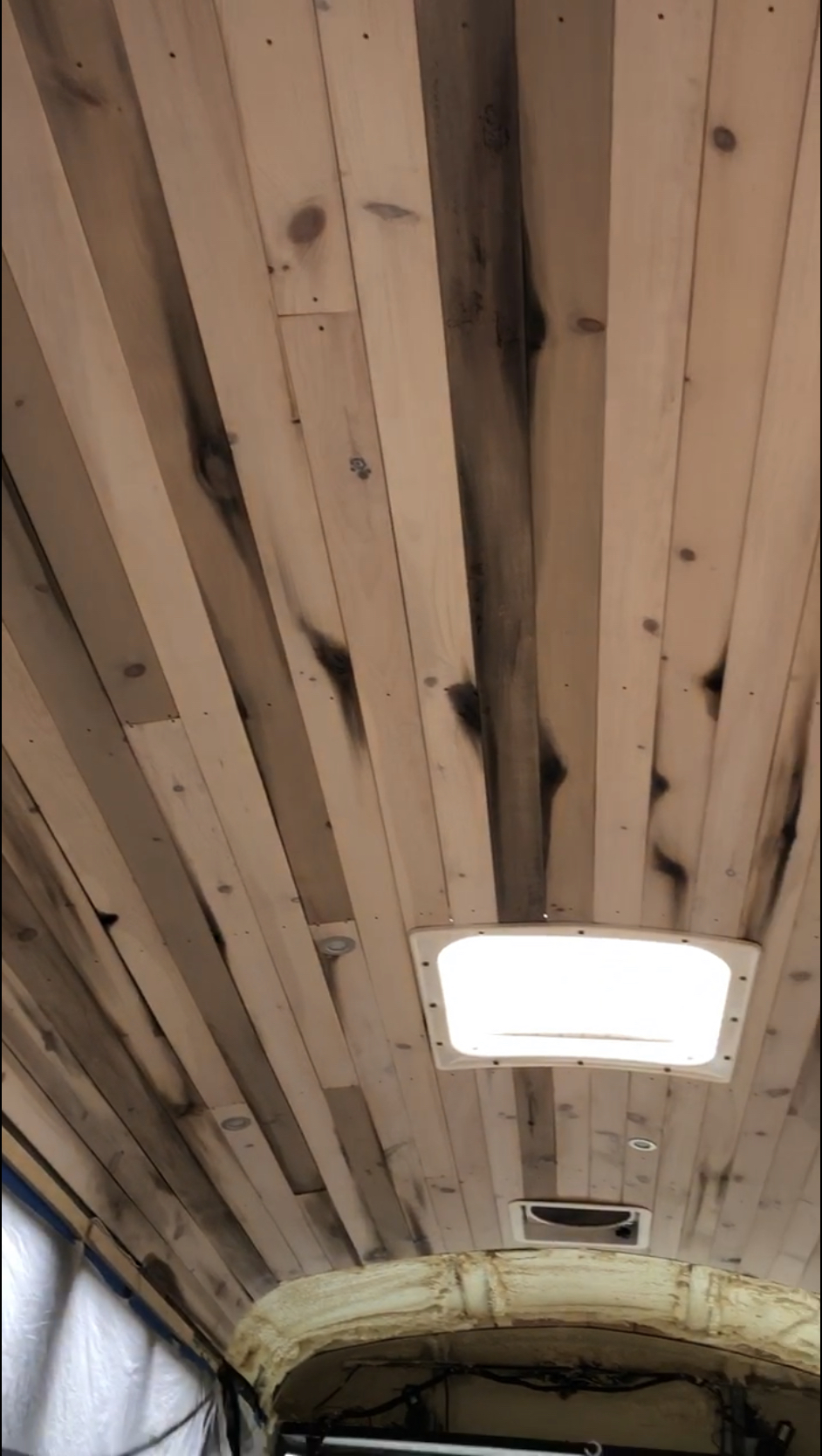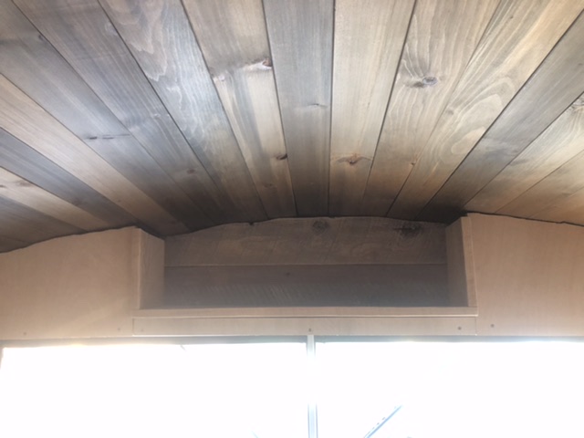 Joe attached furring strips to the bus’s metal ribs. We then screwed the planks to those. (But not before we sprayed foam insulation.)