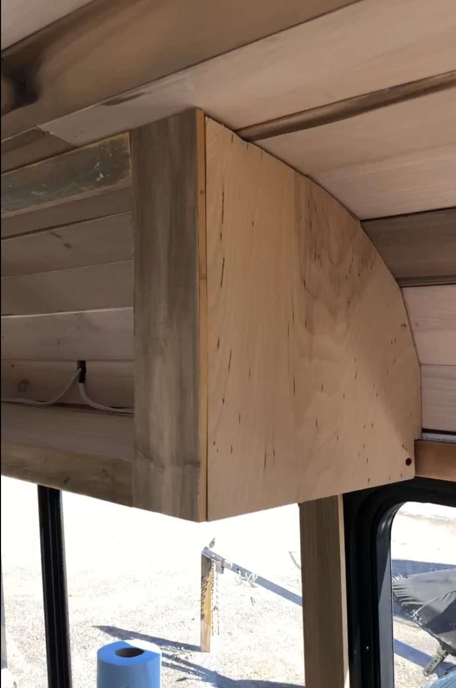 Next I built upper cabinets for our kitchen. I traced the curve of the ceiling onto cardboard using a drawing compass set at a fixed distance (thanks Bob!). Then I transferred the shape to plywood and cut it using a hand held battery operated jig saw.