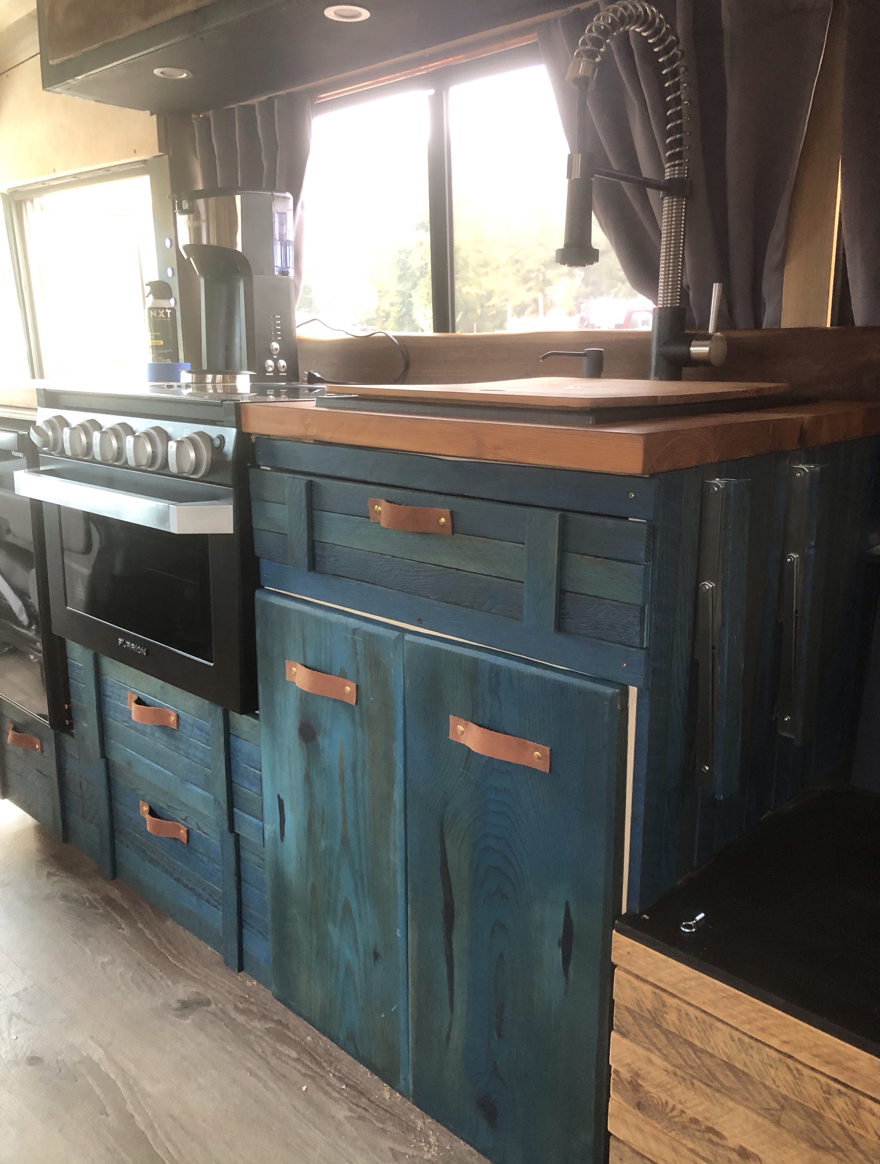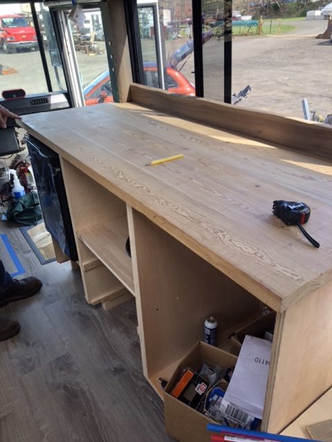 Next came the kitchen base cabinets. I built them out of 3/4” plywood. Even though I didn’t have to deal with a ceiling curve, the bus handed me new challenges. Nothing was square and it took me several tries before the cabinets were flush enough to screw together.