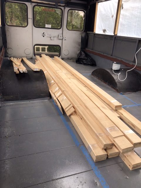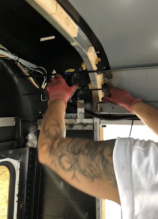 School buses, in case you didn’t know, are made from some kind of kryptonite that makes them indestructible. It also makes it very difficult to screw anything into them. We used wood-to-metal self tapping screws and an impact driver, and clamped the wood to the ribs to keep it in place.