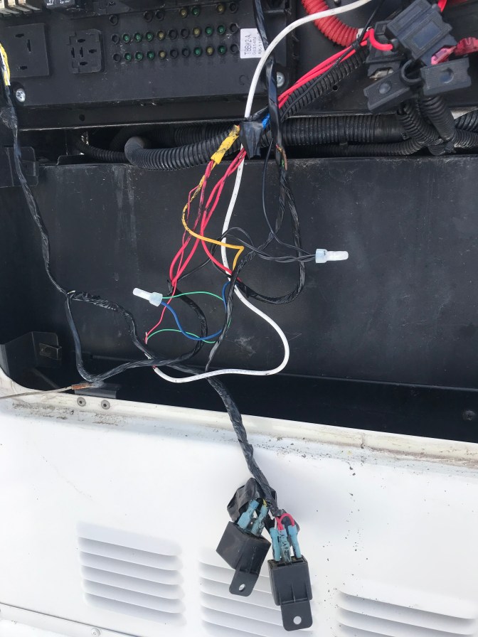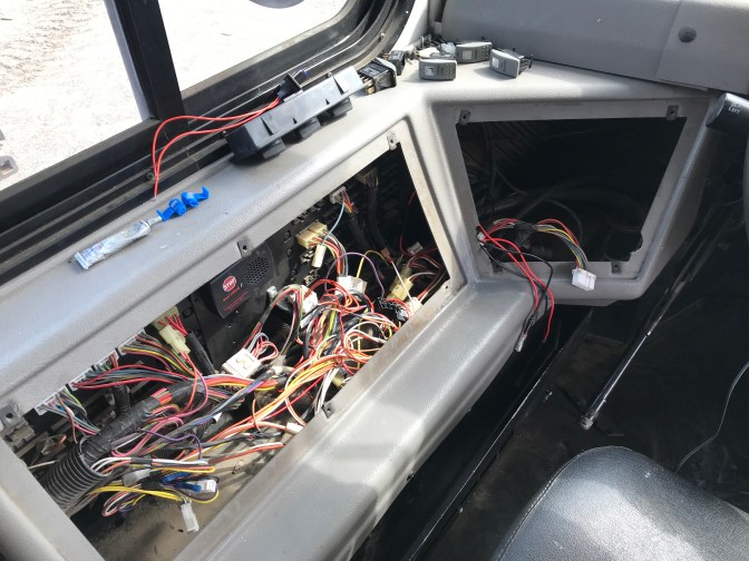 Since the bus was originally for grownups and not kids, it was not equipped with the mandated ‘no child left behind’ wiring – used to force the driver to check all seats and whack a button at the rear of the bus before sidling home for the day. This wiring was added later. The aftermarket wiring was a hack job, and pretty troublesome to remove. All of this ties into starting circuits, so the smallest mishap could disable the bus.