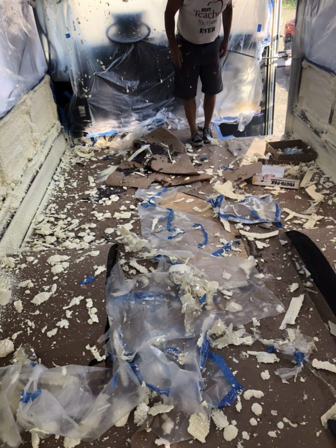 We were eager to jump into the demo mostly because we needed to see the blank slate before we could begin to envision and plan the build. We decided – against the advice of many – to remove the two chassis driven air conditioners. We felt that because they took up too much interior room, took up too much underbody room, and would become a major maintenance demand we couldn’t justify their use only while driving. Pulling those was one long physically exhausting day, with the help of our dear friend, Bob.